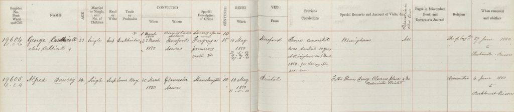 A detailed description of Alfred is available but none of William. Alfred has been described in his prison records as a porter and then later a bricklayer. He was a miller’s son hailing from Bathwick and his physical presence is of a 14 year-old boy with dark brown hair, grey eyes and under five feet tall.