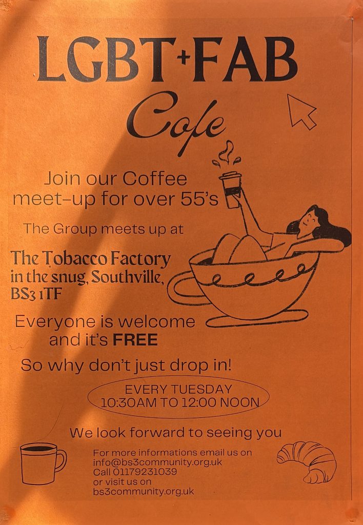 The LGBT+ FAB Café meets every Tuesday from 10.30 – 12.00 in the snug in the Tobacco Factory on North Street.